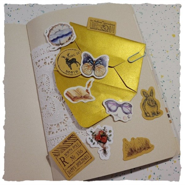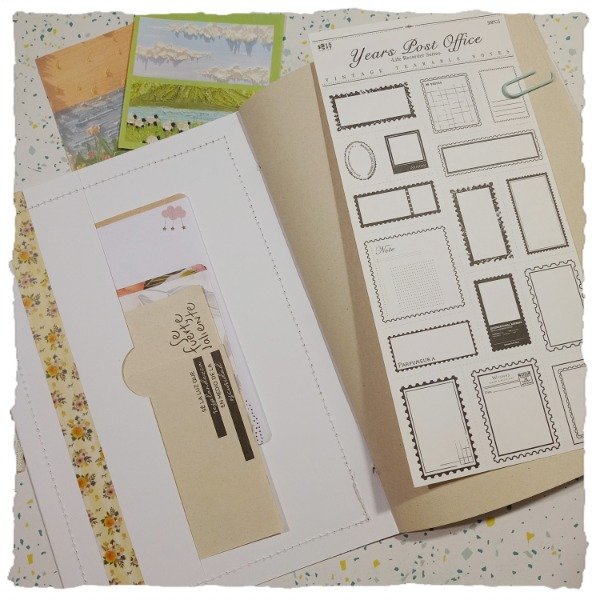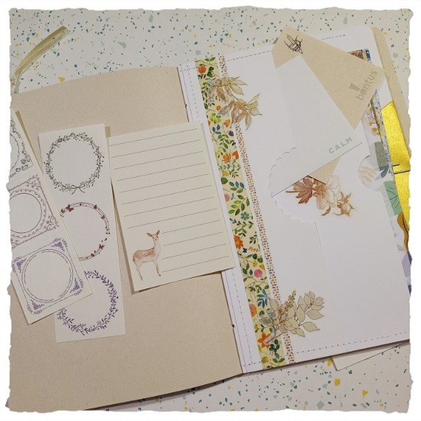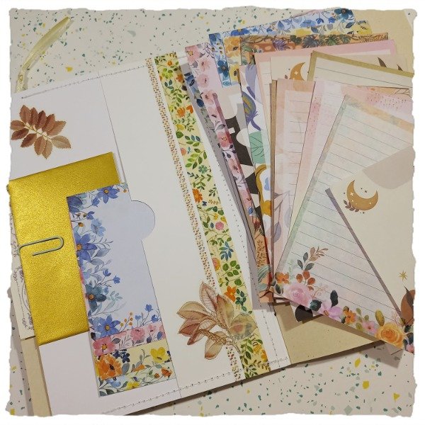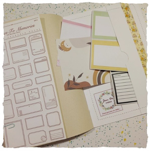 Trae: 2 planchas de marcos troquelables en papel, 30 papeles diferentes para notas o tipo cartas, 10 stickers "cajita" en sobre dorado, 10 es stickers notas, 2 blondas, 5 clips, 6 marcos troquelables redondos y cuadrados, 1 señalador, 1 sobre con dos bolsillos y 2 sobres internos en tapa y contratapa.