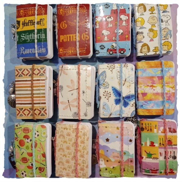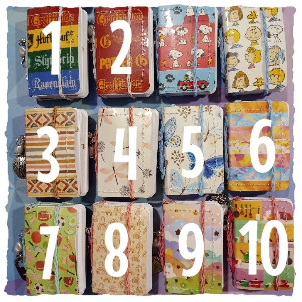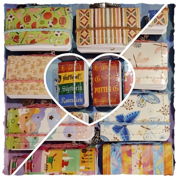 Detalle: midoris súper pequeños, con tres insertos (*) de 20 hojas cada uno en color blanco. La tapa está protegida con film cristal, trae un dije colgante en el lomo, 3 mini clip y elástico para cierre.