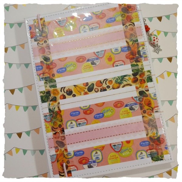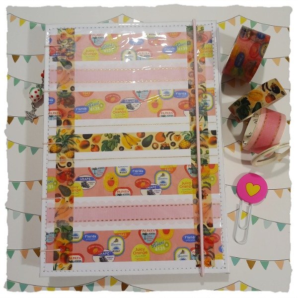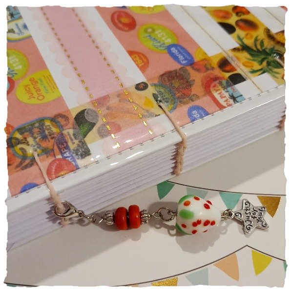 Detalle: cuaderno personalizado de 100 hojas blancas, dije colgante, elástico de cierre y protegido con film cristal.
