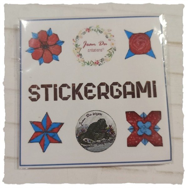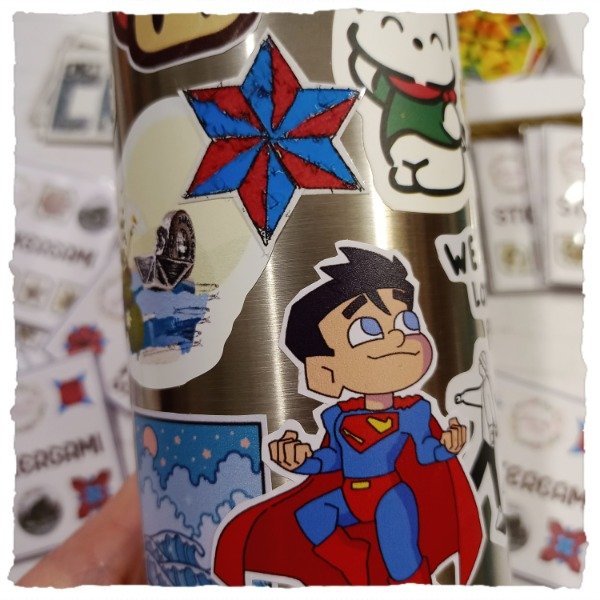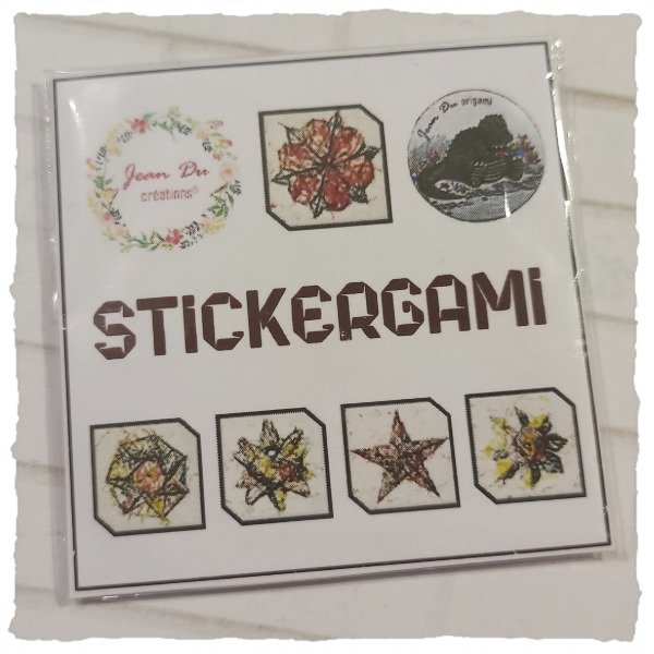 Detalle: stickers artesanales de fotos de origamis editados digitalmente, papel obra protegido con contact transparente.