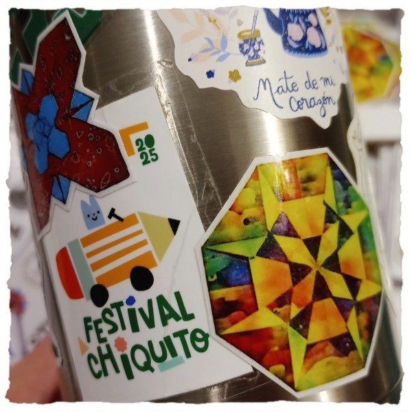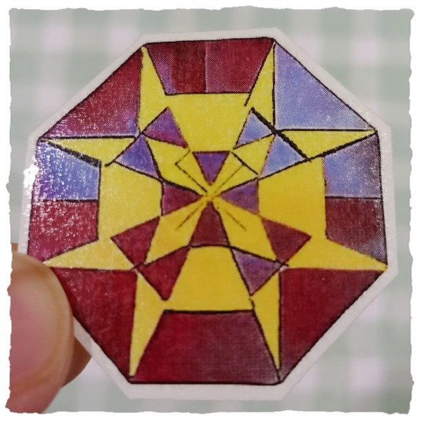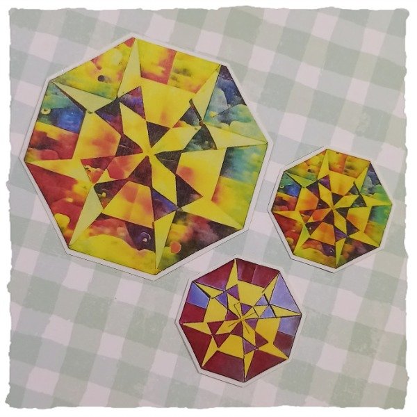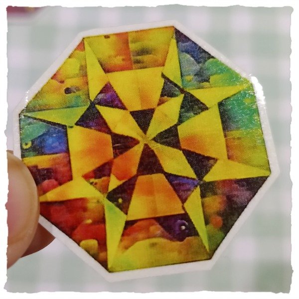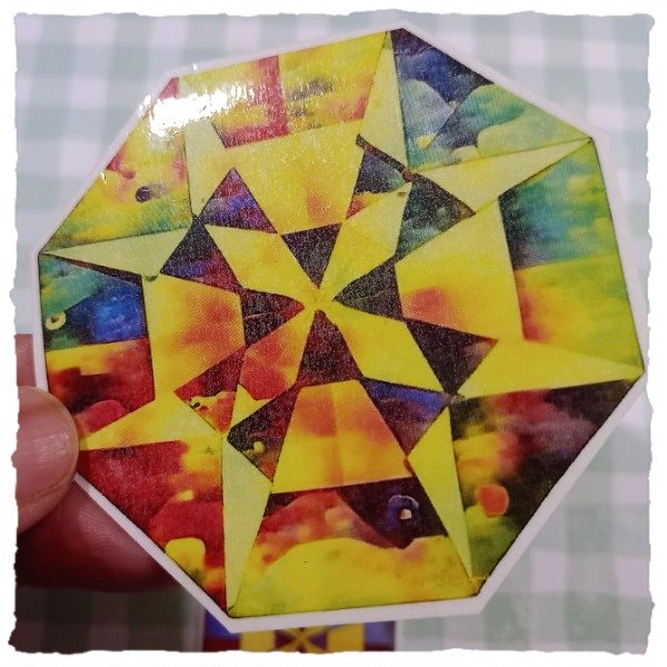 Detalle: stickers artesanales de fotos de origamis editados digitalmente, papel obra protegido con contact transparente.