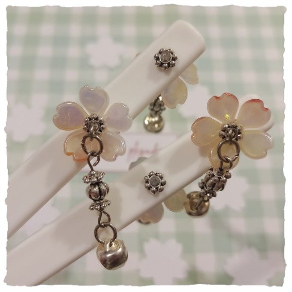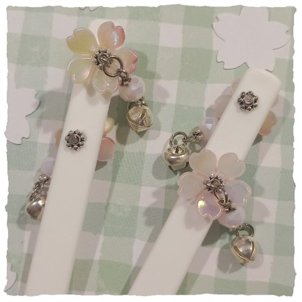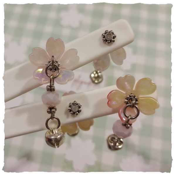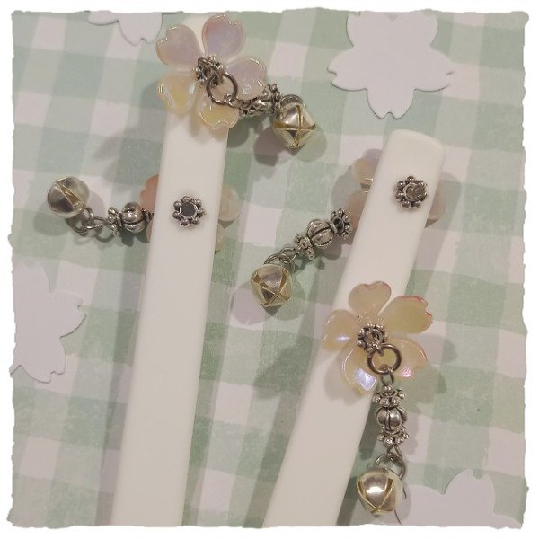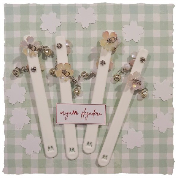 Detalle: plegadera de plástico duro, con flores similares a sakura y cascabeles, en dos modelos que se diferencian en el colgante. Las flores pueden variar dentro de las que se ven en las imágenes.